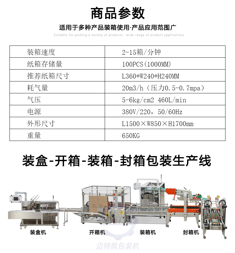 · 適用范圍廣,可滿足多種規格產品裝箱;
