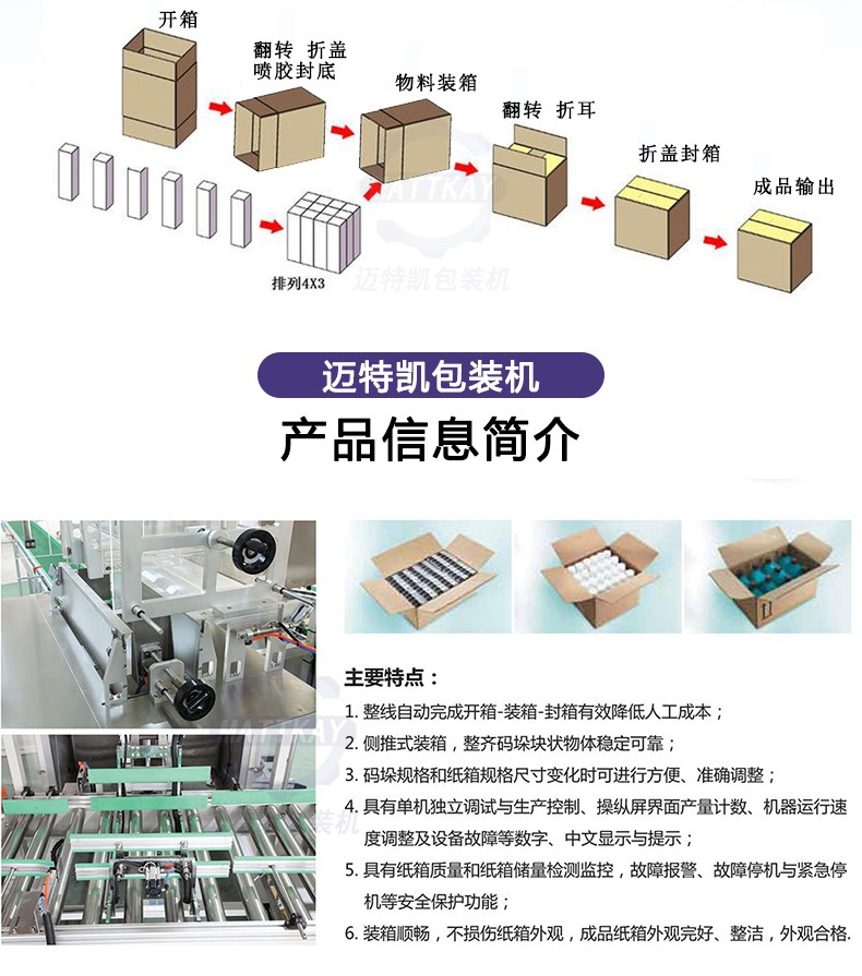 本自動裝箱機是采用紙箱側翻、產品平推式入箱方式裝箱,其中涉及產品來料、理料、推料、紙箱翻轉等機構,裝箱機采用PLC控制,無須人工千預;此外設備可以根據客戶裝箱要求,在前期排列整理過程中即可自動完成所需的裝箱方式整理。